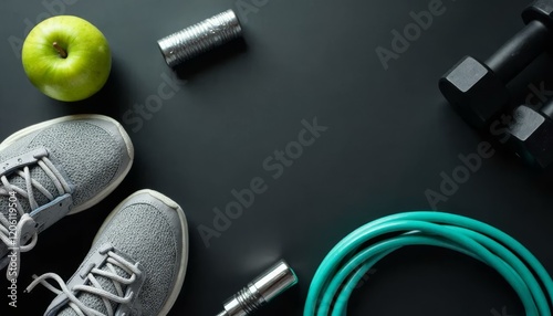 Fitness Gear Still Life_ Shoes, Dumbbells, Apple, Rope