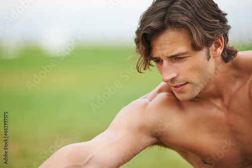 Fitness, stretching and face of man on grass for workout, summer sports and wellness in outdoor training. Exercise, warm up and shirtless athlete on lawn for health, muscle and body care commitment.