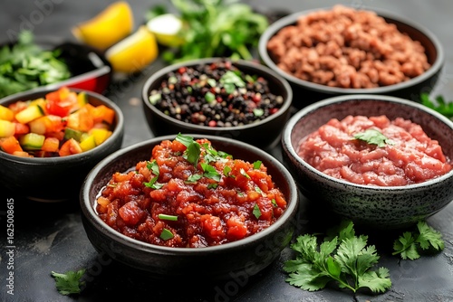 Five bowls of colorful dips and ingredients, garnished with fresh herbs on dark surface food salsa
