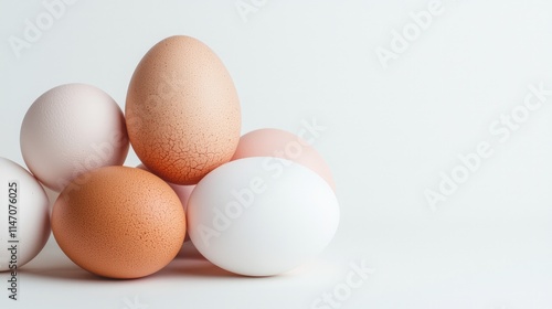Five eggs of varying shades of brown and white arranged in a pyramid shape against a white background.