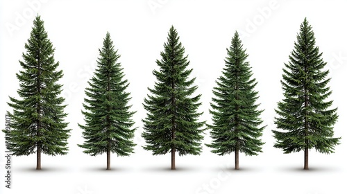 Five Green Pine Trees on White Backdrop Evergreen Woodland Forest Nature
