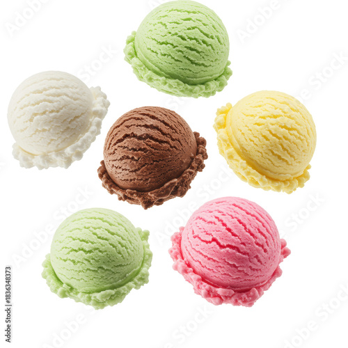 Five perfectly spherical scoops of vanilla, chocolate, green, pink, and yellow ice cream, distinct and textured, isolated on a transparent background with copy space, delicious dessert variety concept