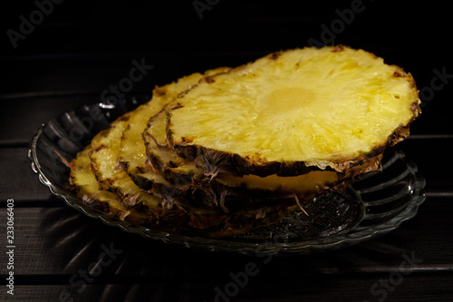 Five pieces of ripe pineapple lie in a transparent plate on a dark wooden background