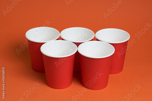 Five red disposable cups on a brown background. Place for text