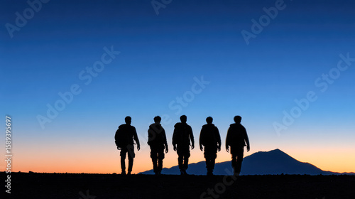 Five silhouetted people walk together at sunset with a mountain in the background under a clear, colorful sky.