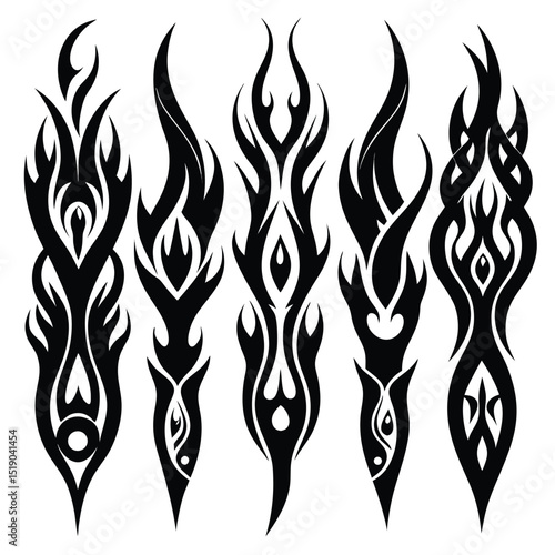Five Unique Black Tribal Tattoo Designs on a White Background