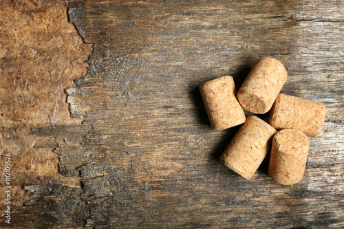 Five wine corks on old wooden background, close up