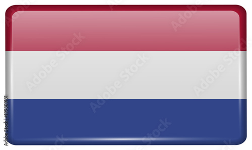 Flags Netherlands in the form of a magnet on refrigerator with reflections light.