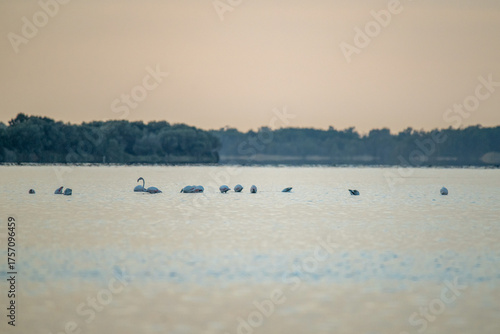 Flamingoes at dawn pastel colors in middle of water pond Biguglia in Corsica near Bastia Tall grasses on the background