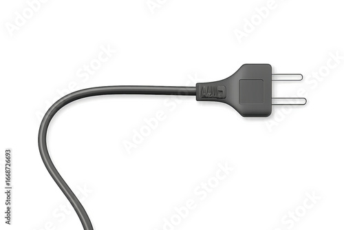 Flat black AC power plug with two vertical blades and slightly curved cord on transparent background. Concept of practical connectivity