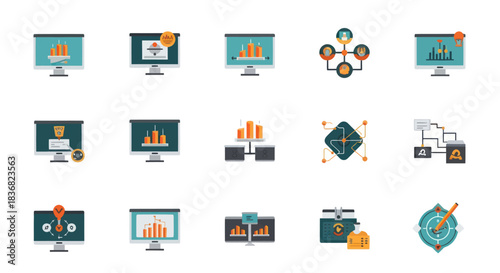 Flat Design Digital Icons Collection for Data Analysis Business and Technology Concepts.