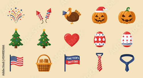 Flat icons representing various American holidays and traditions, including Christmas, Thanksgiving, Halloween, and Easter.