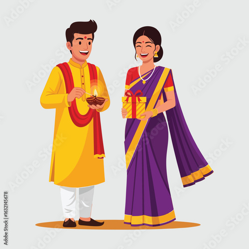 Flat illustration of Indian man and woman celebrating Diwali with diya and gift