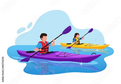 Flat illustration of two people enjoying a kayaking trip on the water, paddling their colorful kayaks
