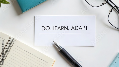 Flat lay of white card displaying motivation quote and pen