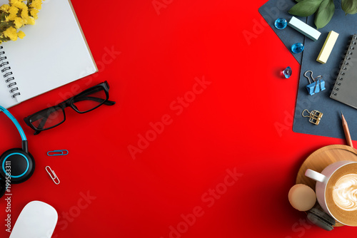 Flat lay, top view office table desk. Workspace with blank note book, keyboard, macaroon, office supplies, yellow flowers, green leaf, blue ornament and coffee cup on red background.