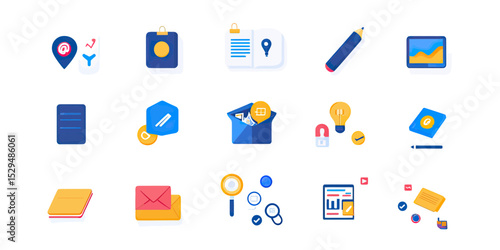 Flat minimalist vector set of business and office icons including location, notes, envelope, magnifying glass, pencil, file, light bulb, and data chart for digital marketing and communication
