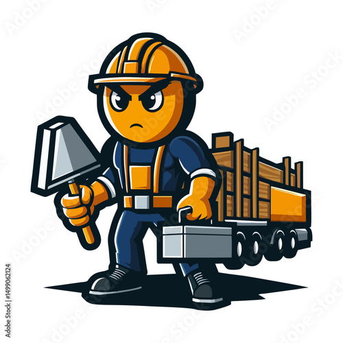Flat style cartoon mascot builder holding tool smiling in helmet and uniform vector illustration for construction business branding contractor services design