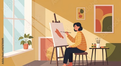 Flat stylized illustration of a woman painting on a canvas in a cozy home studio