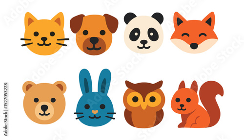 Flat vector icons of adorable animals: cat, dog, rabbit, panda, fox, bear, owl, squirrel.