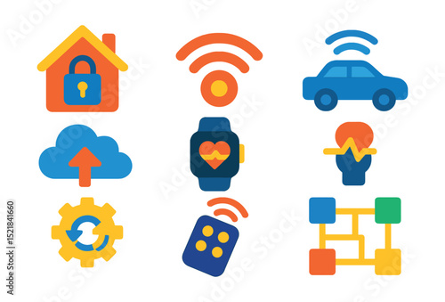 Flat vector icons of IoT communication: smart home devices, sensor signals, connected car, wearable tech, cloud sync, automation, remote control, device network.