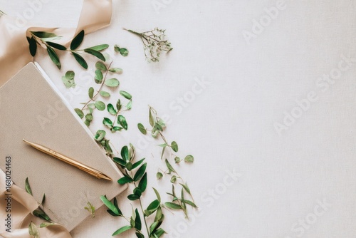 Flatlay of notebook, pen, greenery, and ribbon
