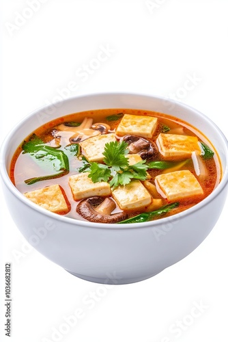 Flavorful tofu and mushroom soup with fresh greens