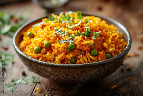 Flavorful turmeric rice paired with green vegetables high resolution picture