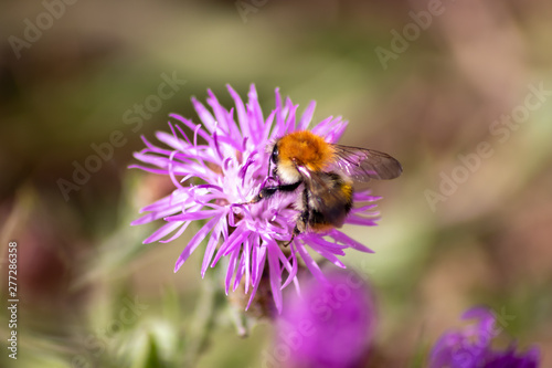 Fleißige Biene bestäubt eine pink-violette Blüte auf der Suche nach Nektar für Honig inkl. unscharfer Hintergrund