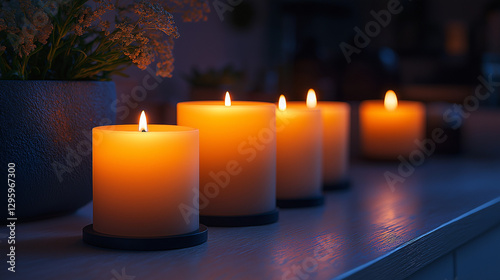 Flickering candles cast a warm, inviting light on a serene evening. The gentle glow enhances the tranquil atmosphere of the room, perfect for relaxation