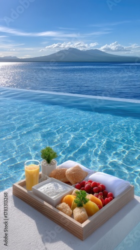 Floating Breakfast Tray Overflowing With Fresh Tropical Fruits Pastries And Orange Juice Set In A Sparkling Blue Infinity Pool With Distant Mountains Under A Bright Sunny Sky