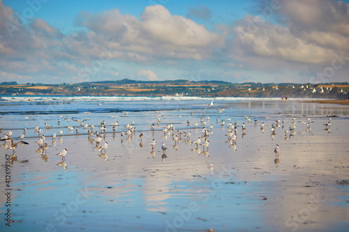 Flock of seagulls on Atlantic ocean beach in Finistere, Brittany, France