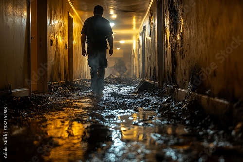Flooded Hallway With Debris and a Silhouette Walking Through Water at a Dimly Lit Location in the Aftermath of a Storm
