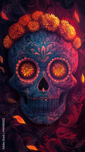 Floral Adorned Sugar Skull with Carvings and Marigold Petals - Floral Shadows Days Of The Dead - Vibrant and Symbolic Illustrations