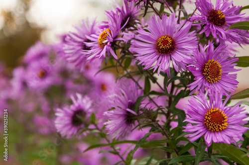 Floral background of autumn purple aster flowers on a bush with selective focus on the petals and blurred background.