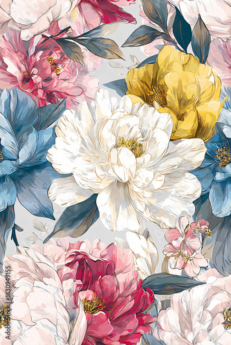 Floral Botanical Peony Bloom Vibrant Colors Whimsical Tropical Illustration Art Design Lush Decorative Elegant Romantic Growth Textile Background Digital Spring Summer Organic Beauty