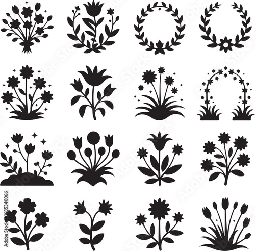 Floral motifs and decorative plant silhouettes on white background Keywords: floral, flower