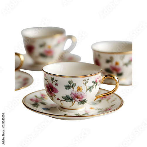 Floral Patterned Tea Set with Gold Trims on transparent background