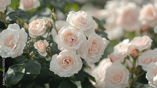 Floral Roses Blossom In The Garden Closeup View Of Beautiful Rosa Georgette Flower Cluster Of Light Pink And White Petals Spring Blooming In The Park