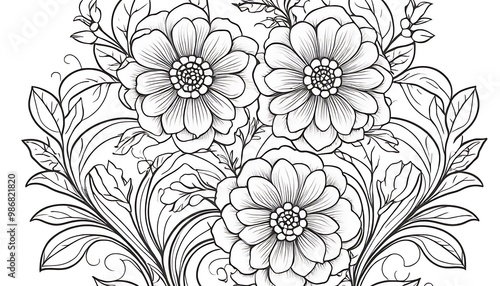 Floral seamless pattern,Black and white coloring page featuring various detailed flowers and plants together in a harmonious arrangement, designed for relaxation and creativity through the art,564