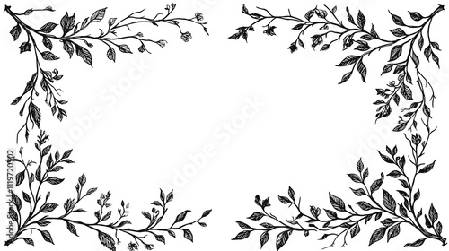 Floral vintage frames with silhouettes of branches, leaves and vines. Hand drawn elegant delicate botanical borders and wreaths Isolated transparent background png wedding invitation, card, page boder