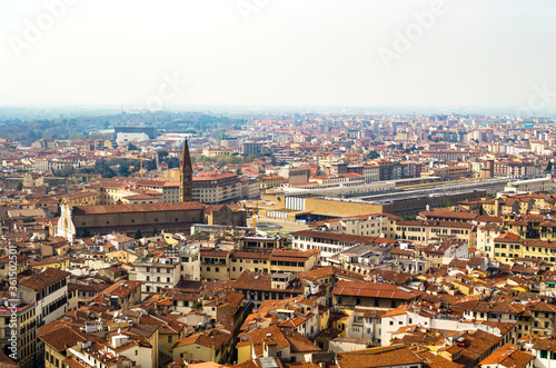 Florence, Italy. An aerial view of the city landscape seen from the bell tower of Santa Maria del Fiore church. Here you can see the train station surrounded by the typical red roofs of the town