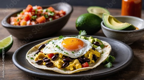 Flour tortillas filled with scrambled eggs, black beans, and topped with a sunny-side-up egg at a vibrant brunch setting