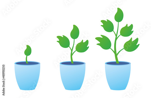 Flowerpot with houseplant sprout, small and big green plant in a pot isolated. Gardening, seedling growth stages flat vector illustration.