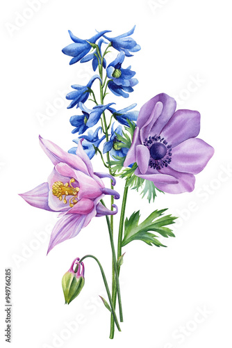 Flowers, branch leaves, buds on white background, watercolor illustration, floral clipart arrangements, wedding design