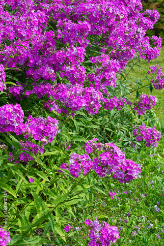 Flowers Phlox subulata flowering in garden on summertime, blooming purple phlox outdoors, flowering vivid leafy plant phlox in garden