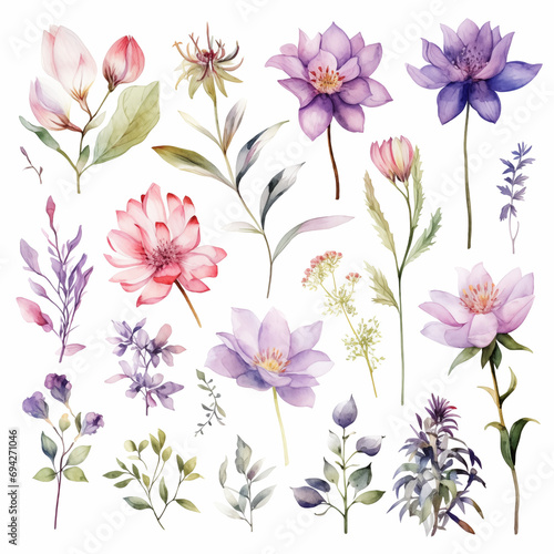 Flowers watercolor illustration, Set watercolor elements