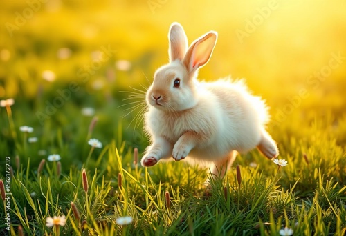 Fluffy bunny hops across sunlit meadow, embodying spring's joyful energy, may, cute