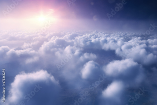 Fluffy clouds with the sun casting a soft glow in a clear blue sky