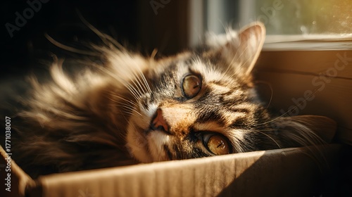 Fluffy feline resting comfortably inside a cardboard container illuminated by warm sunlight